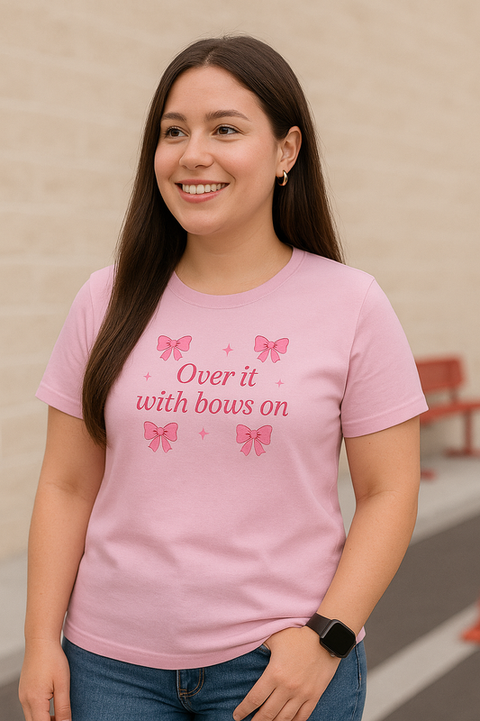 Pink "Over It" Bow T-Shirt | Sassy and Sweet Bow Tee | Playful Pink T-Shirt with Bows | Stylish "Over It" Slogan Tee