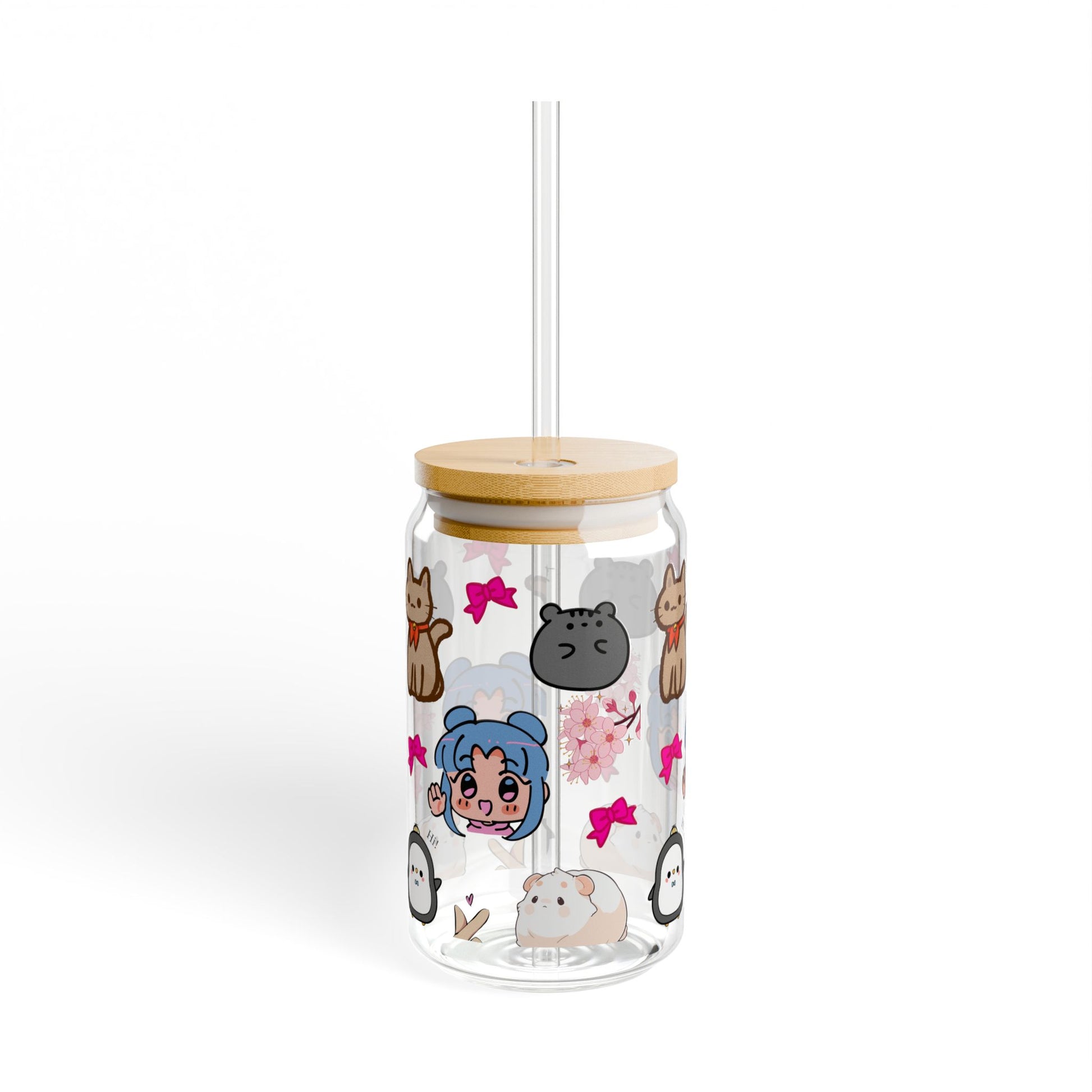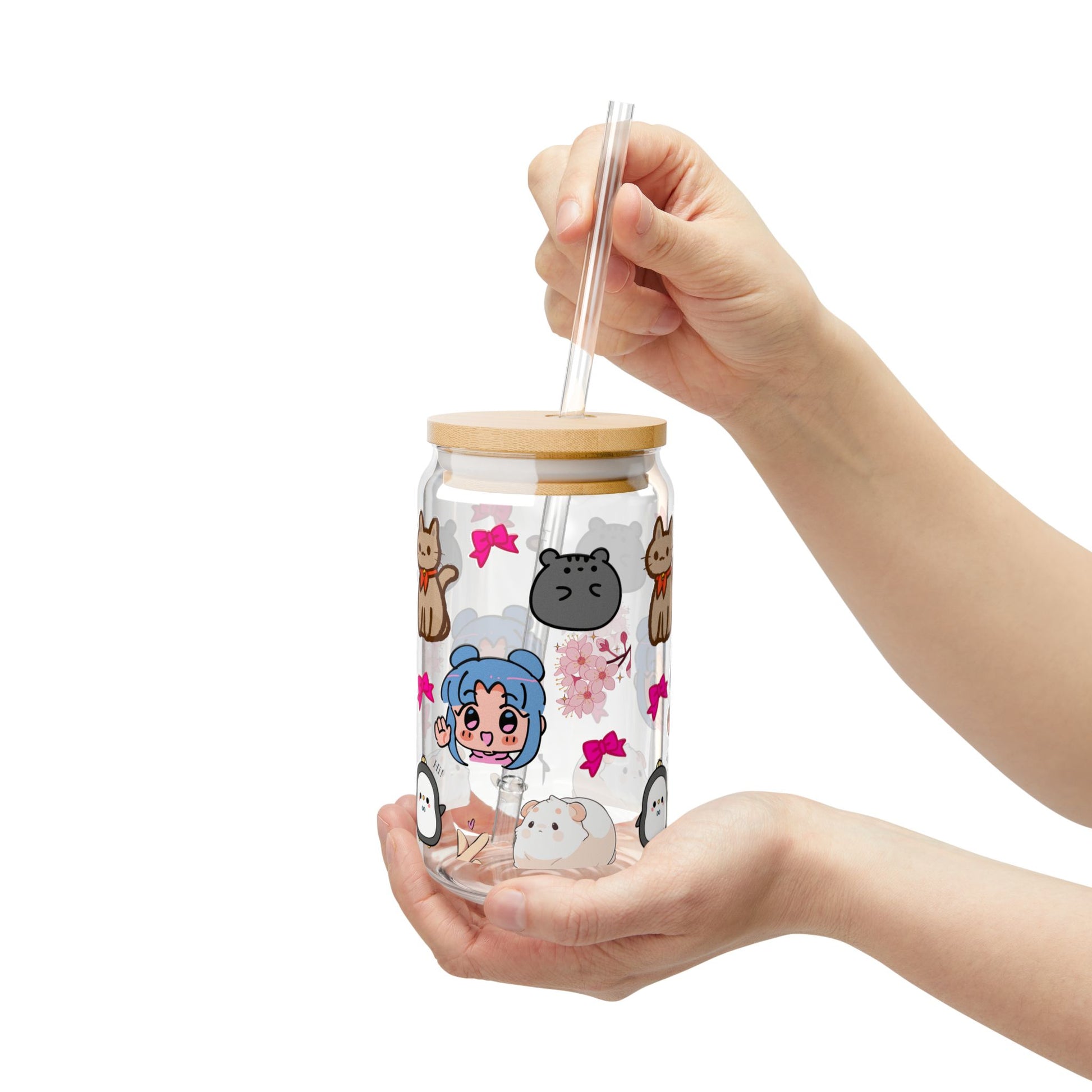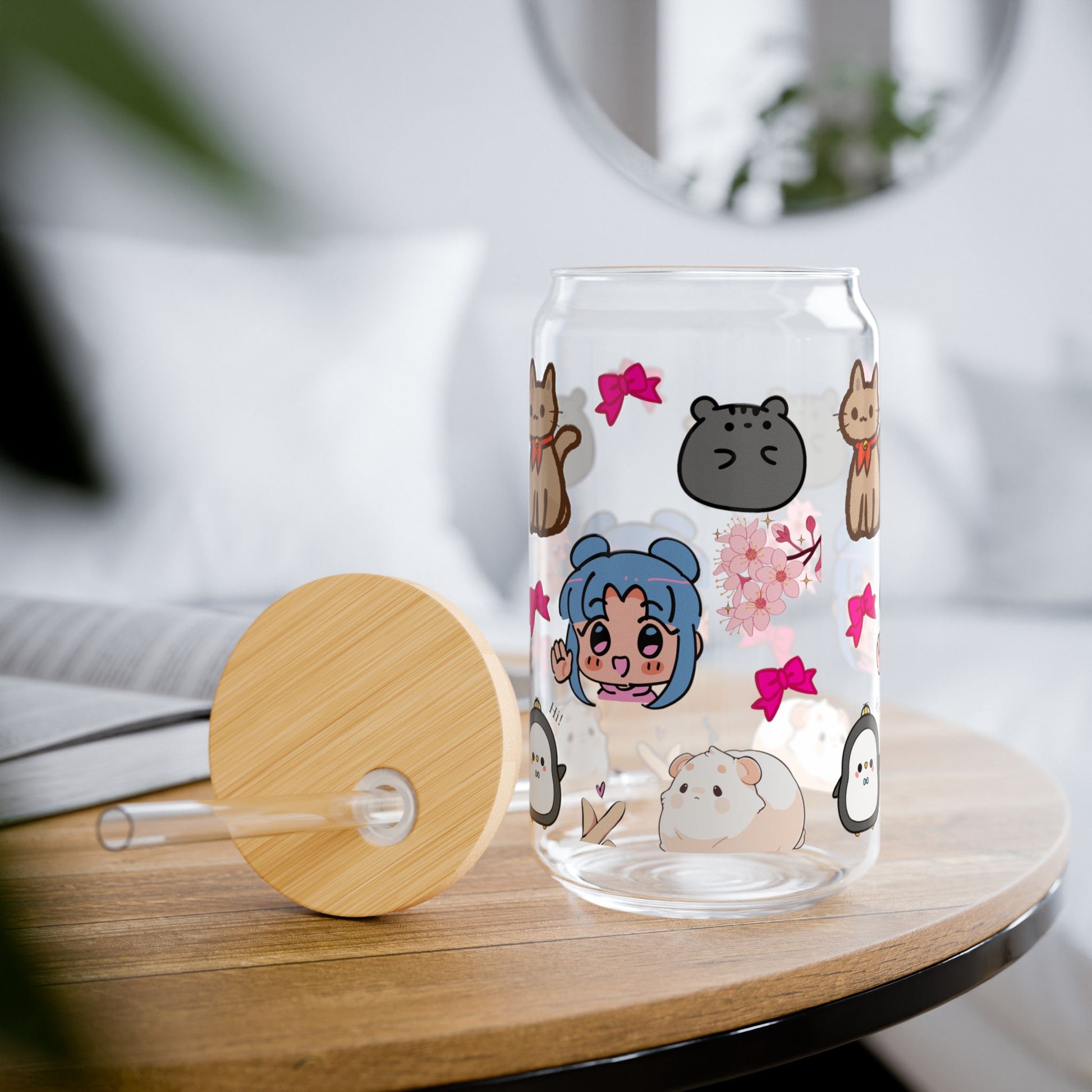 Cute Character Sipper Glass - 16oz with Straw and Wooden Lid | Anime lover